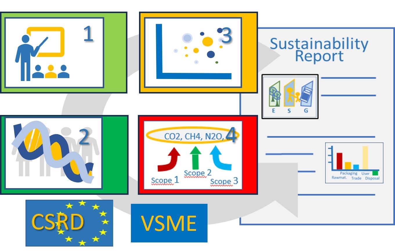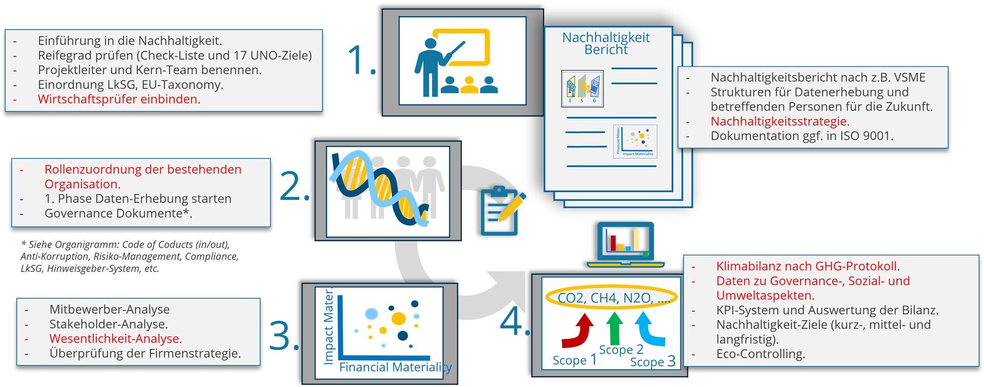 Sustainability check, SDG allocation, form core team, define roles for executive board/supervisory board, environment analysis, involve auditors (not for VSME).